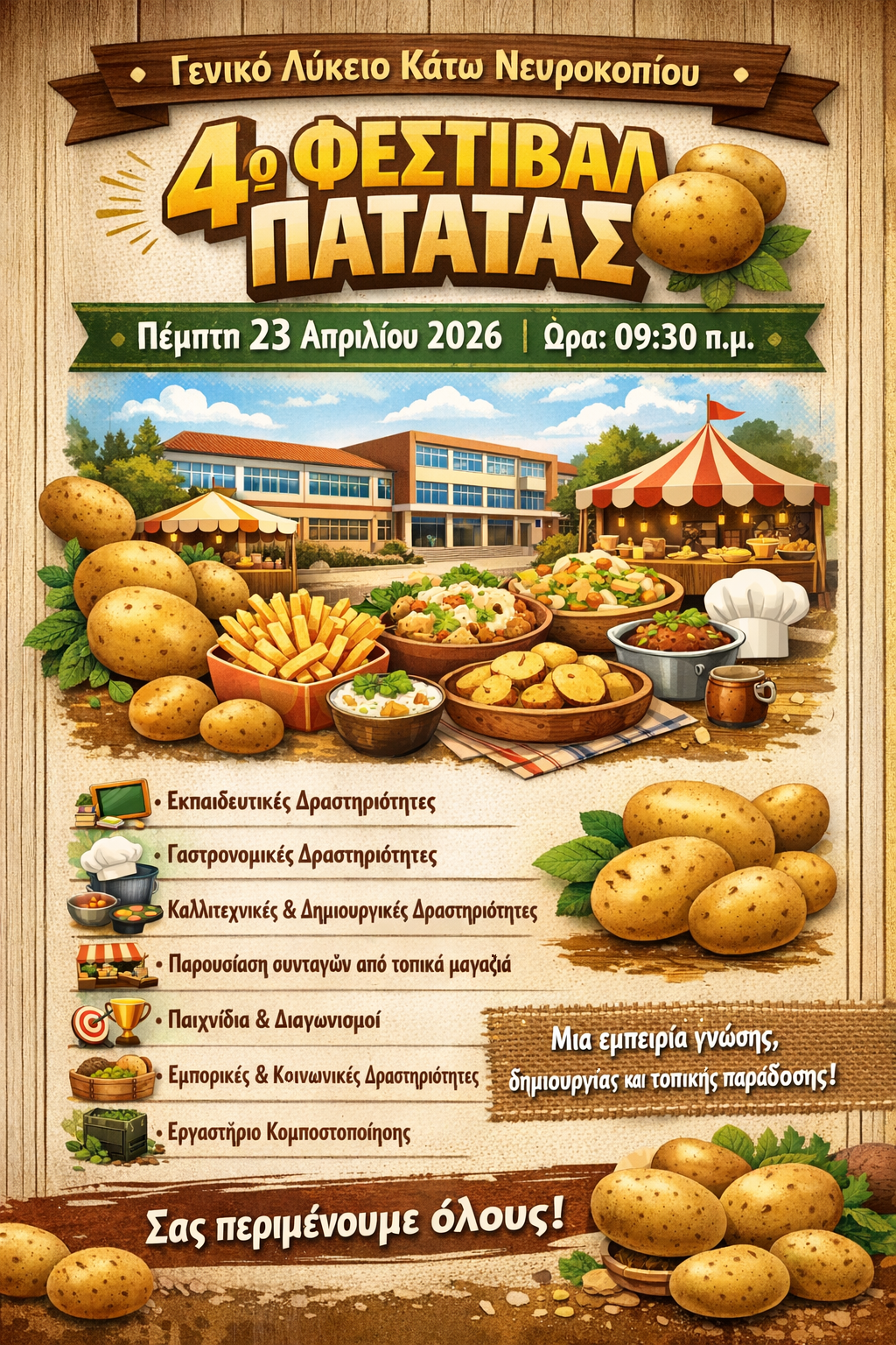 4ο Φεστιβάλ Πατάτας από το Γενικό Λύκειο Κάτω Νευροκοπίου στις 23/4/2026 ώρα 09:30 π.μ.