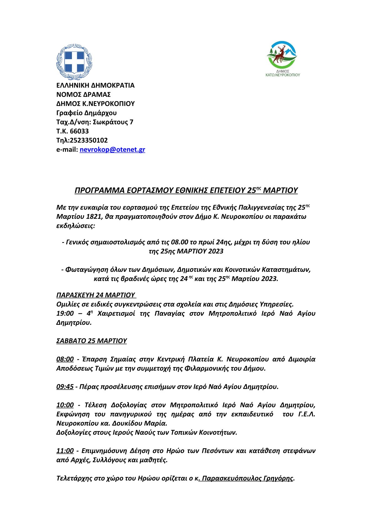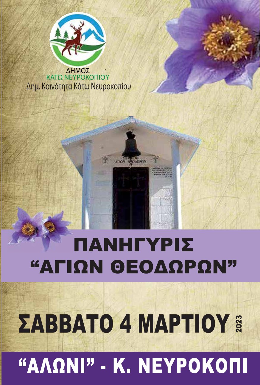 3 Μαρ 2023 ΔΗΜΟΣ ΝΕΑ ΑΝΑΚΟΙΝΩΣΗ ΓΙΑ ΤΗΝ ΕΚΔΗΛΩΣΗ ΤΟΥ ΕΟΡΤΑΣΜΟΥ ΤΩΝ ΑΓΙΩΝ ΘΕΟΔΩΡΩΝ ΣΤΗΝ Δ.Κ. ΚΑΤΩ ΝΕΥΡΟΚΟΠΙΟΥ.
