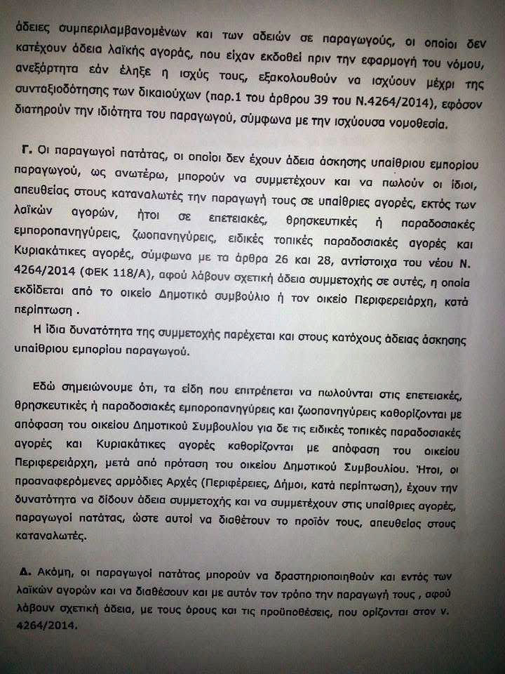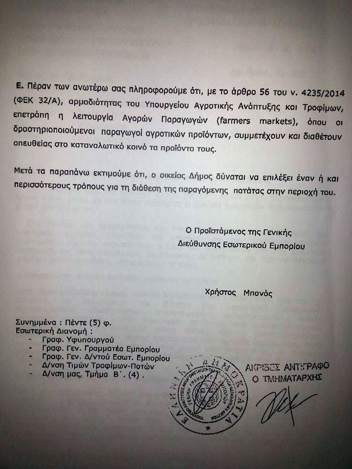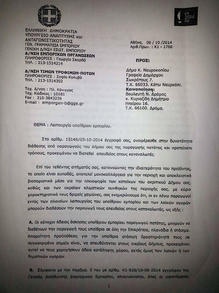 Η Δ/νση Τροφίμων και Ποτών του υπουργείου Ανάπτυξης και Ανταγωνιστικότητας, με επιστολή της προς τον Δήμο Κάτω Νευροκοπίου ενημερώνει αναφορικά με το Υπαίθριο Πλανόδιο Εμπόριο Πατάτας, μετά τις επιστολές του Δημάρχου κ. Βασίλη Γιαννόπουλου.