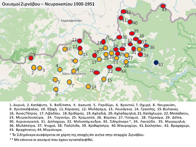 Ζίρνοβο (Kάτω Νευροκόπιον) : 2.120 άτομα το 1900, 2.105 άτομα το 1913, 2.186 άτομα το 1920, 2.060 άτομα το 1928.