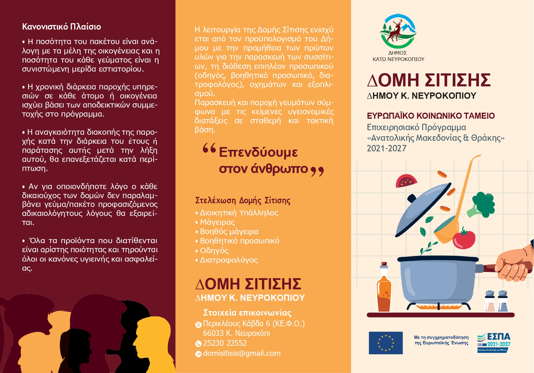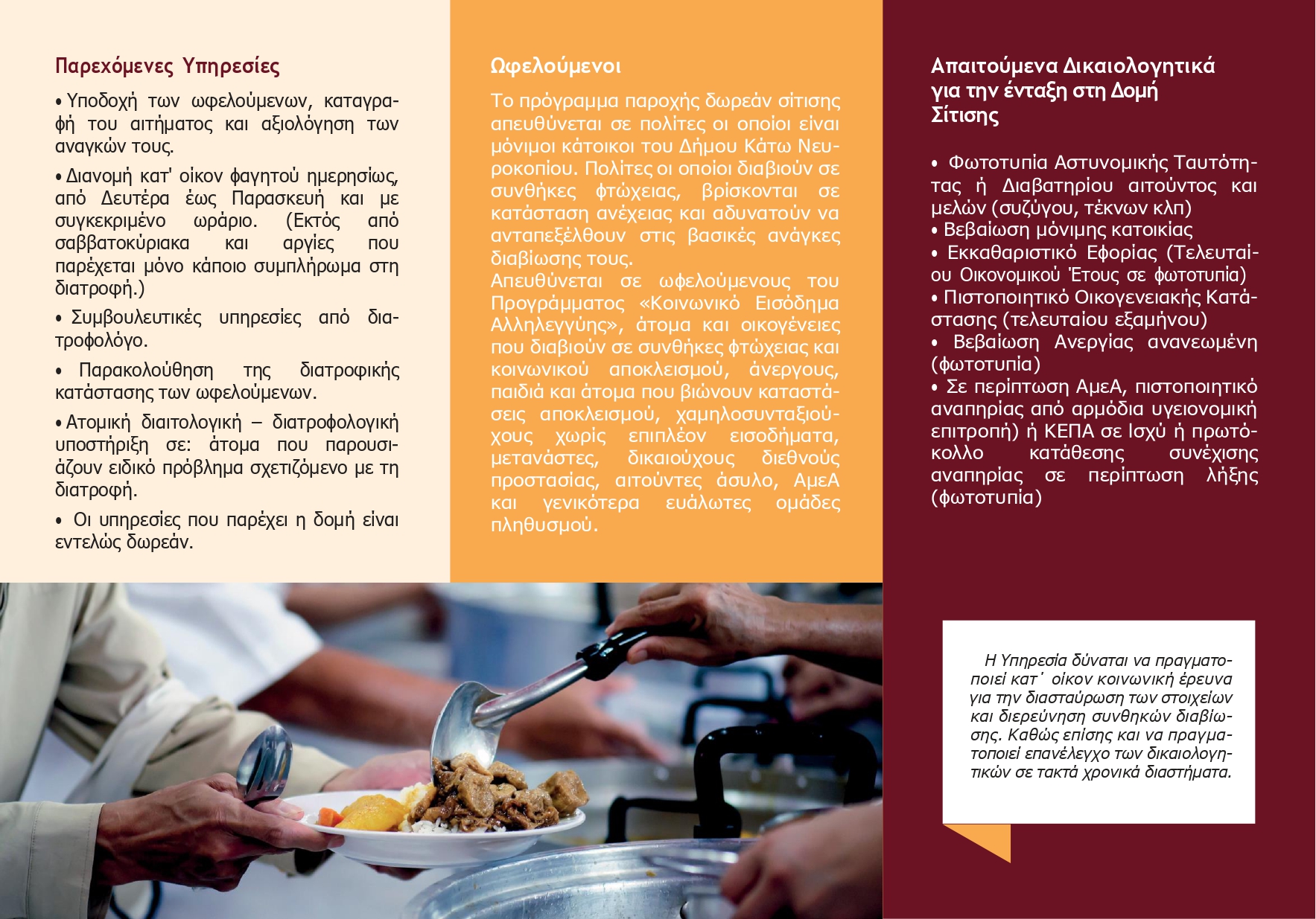 Το πρόγραµµα παροχής δωρεάν σίτισης απευθύνεται σε πολίτες οι οποίοι είναι µόνιµοι κάτοικοι του Δήµου Κάτω Νευροκοπίου. Πολίτες οι οποίοι διαβιούν σε συνθήκες ϕτώχειας, βρίσκονται σε κατάσταση ανέχειας και αδυνατούν να ανταπεξέλθουν στις βασικές ανάγκες διαβίωσης τους.